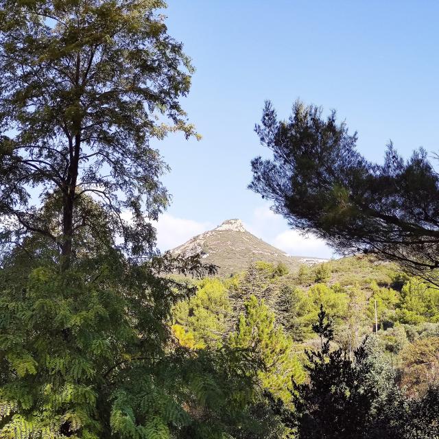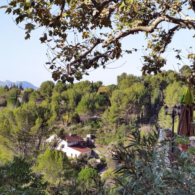 La visite débute donc par une première d’une longue lignée, pour entrer au cimetière où je découvre la tombe joliment fleurie et décorée de Marcel Pagnol. En quittant les lieux j’admire le paysage. Une vue panoramique couvre la chaine de St Cyr et la Barasse, village où s’arrêtait autrefois le tramway. C’est de là que le petit Marcel et sa famille partaient à pied, pour monter à la Treille. Je marche dans ses pas.