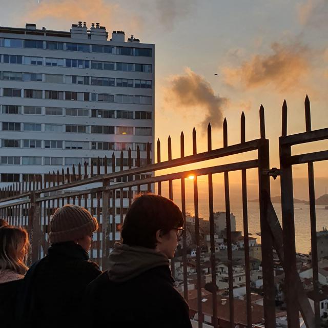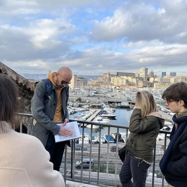 Notre guide Benjamin nous attend juste devant l’Abbaye Saint-Victor. Aujourd’hui nous sommes 8 motivés à découvrir Marseille autrement. Nous sommes très curieux lorsque Benjamin nous explique comment était Marseille dans le passé. Il sort même plusieurs cartes, d’époques différentes, pour qu’on visualise bien tout ce qu’il explique. C’est génial car nous avons une très belle vue sur la ville et nous comprenons donc très bien comment la cité phocéenne a évoluée.